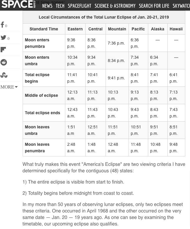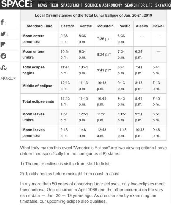 On Jan 20th, 2019, the United States and Canada, with the eastern seaboard having the best view, will see the eclipse of the moon completely immersed in Earth’s shadow. The duration of totality will be longer than normal (1 hour and 2 minutes). The more south you can get the higher in the sky the eclipse will be (NYC about 70 degree, South Florida 80 degrees, Cuba 90 degrees from the horizon).