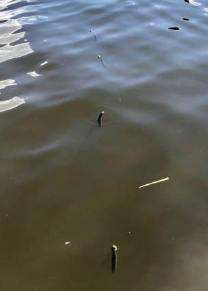 Lately I have noticed the consistent march of mangrove seedpods in the water off the dock–more than normal. These king tides reach higher up into the mangroves, where the pods detach and begin to float vertically in the water, the tides shuttling them to far away places. A soaking of the pod softens the outside shell and it begins to peels away, allowing the seedpod to germinate. The vertical position is by design so when the tide drops the seeds settle upright in the soft muds along the banks, providing the ideal location to spread. I cannot help but think how closely these pods remind me of the seeds of Phragmites, releasing at once, wondering if these mangrove pods are also carrying the alien contagion.