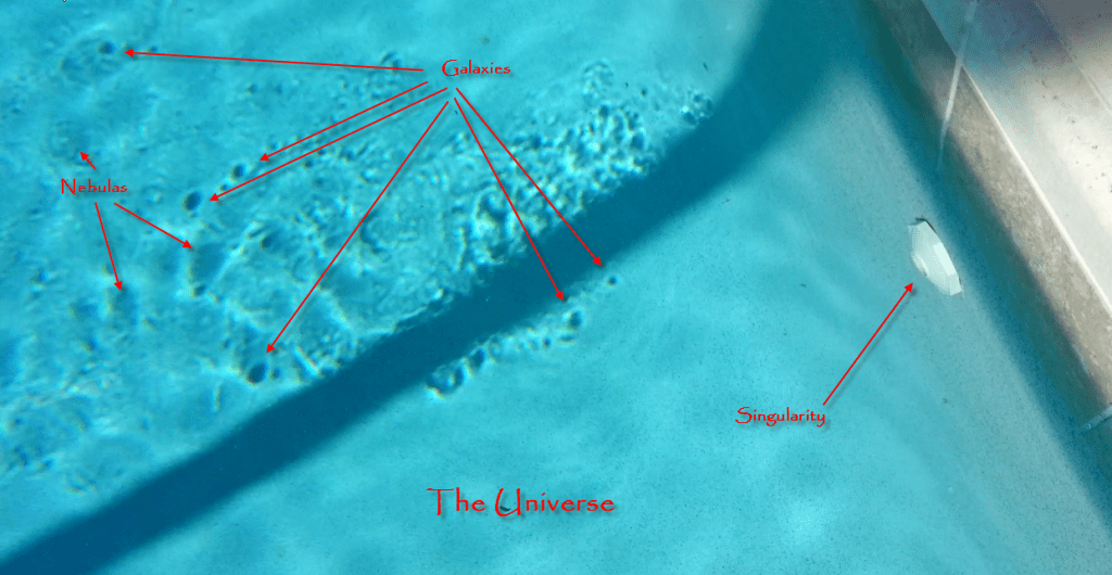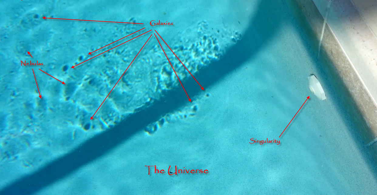 Suppose the jet plume of my pool was the Big Bang, birthing these whirlpools from a singularity. But what was causing those shadows to spin? Why some clockwise and others counterclockwise? Why did some shadows appear so unorganized? What caused some to form perfect spirals in the first place?