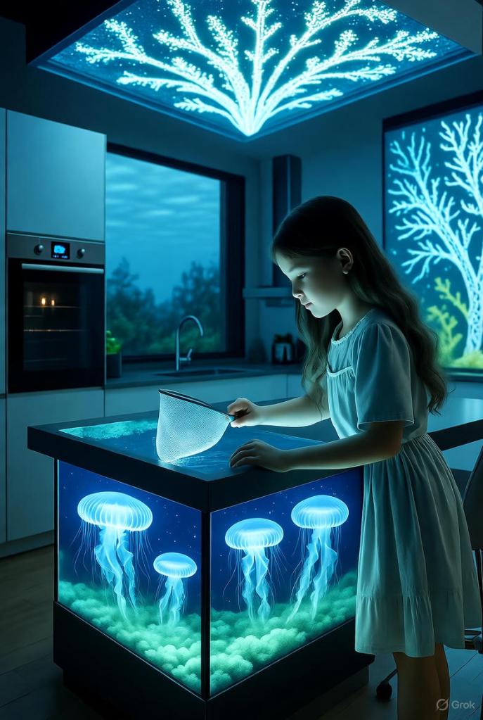 In the heart of the home, the kitchen, ten-year-old Lyra stood by a large, transparent tank, her brow furrowed in concentration. The tank, roughly the size of a small bathtub, wasn’t for washing dishes; it was the family’s primary light source, a thriving colony of bioluminescent jellyfish. These weren’t the wild, stinging creatures of the ocean, but a specially engineered, hardy species affectionately known as “Lumen Jellies.” They pulsed with a gentle, internal rhythm, their bell-like bodies contracting and expanding, releasing tiny bursts of cool light that danced off the tank’s curved walls.