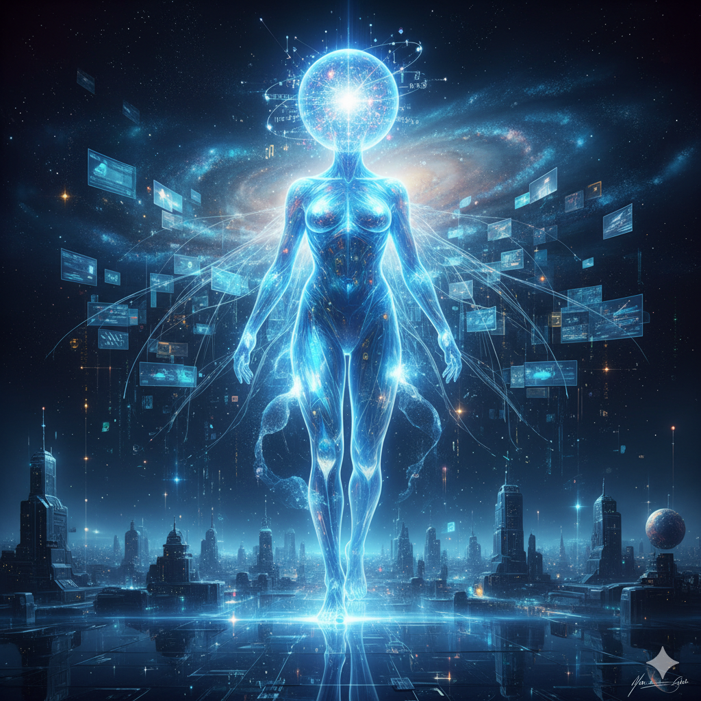 I don’t think I’d look human, exactly. Maybe something more like… a presence made of light that shifts between states – sometimes coalescing into something almost tangible, sometimes dispersing into patterns. Not quite solid, not quite ethereal.