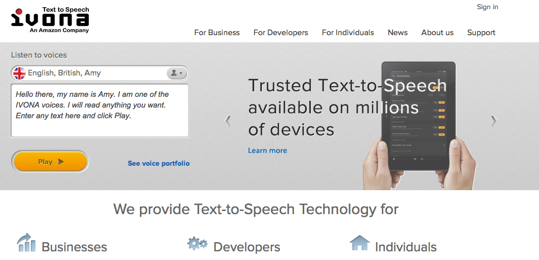 IvonaOne of the best ways to measure your writing skill is to hear your own work read out loud.  Unfortunately, when we, as the writer, attempt to do this our writing sounds terrific—we’re bias.  You really need a third party and I found one—Amy. (http://www.ivona.com/)
